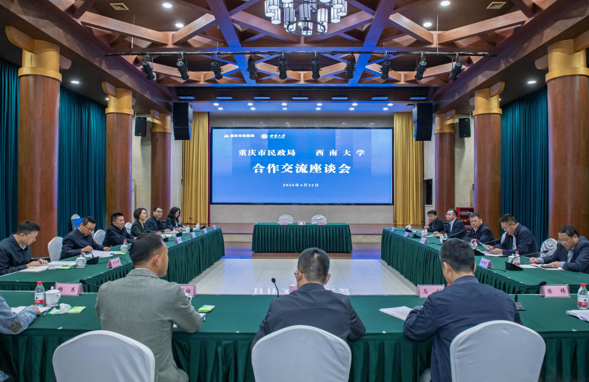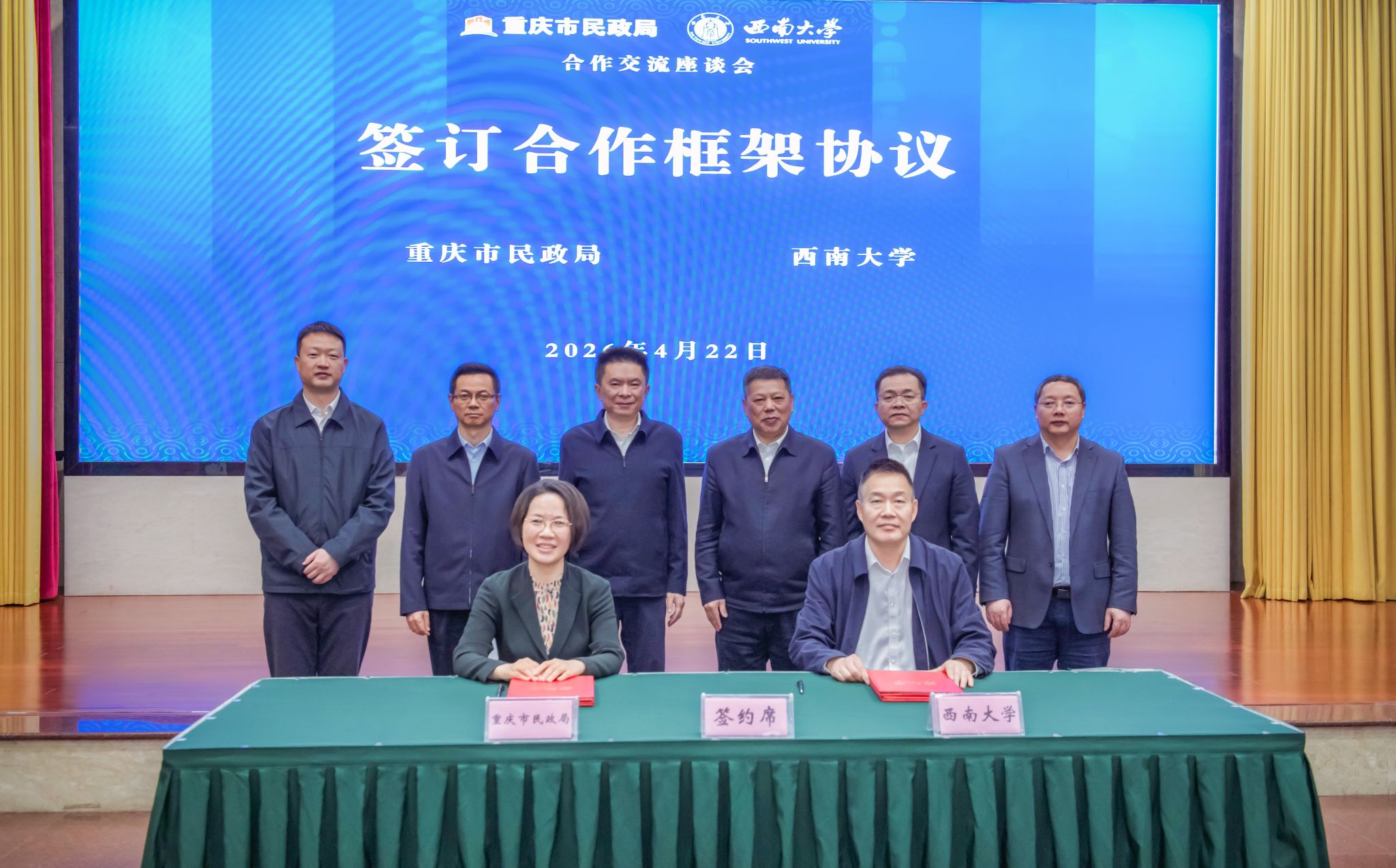 4月22日,学校与重庆市民政局在东方红会议厅举行合作交流座谈。市民政局党组书记、局长阚吉林,党组成员、副局长胡立,二级巡视员谭华,学校党委书记张卫国,党委常委、副校长葛信勇出席会议。胡立、葛信勇代表双方签署合作协议,谭华为“重庆民政心理健康与社会工作促进中心”和“重庆区划地名研究中心”授牌。会议由葛信勇主持。