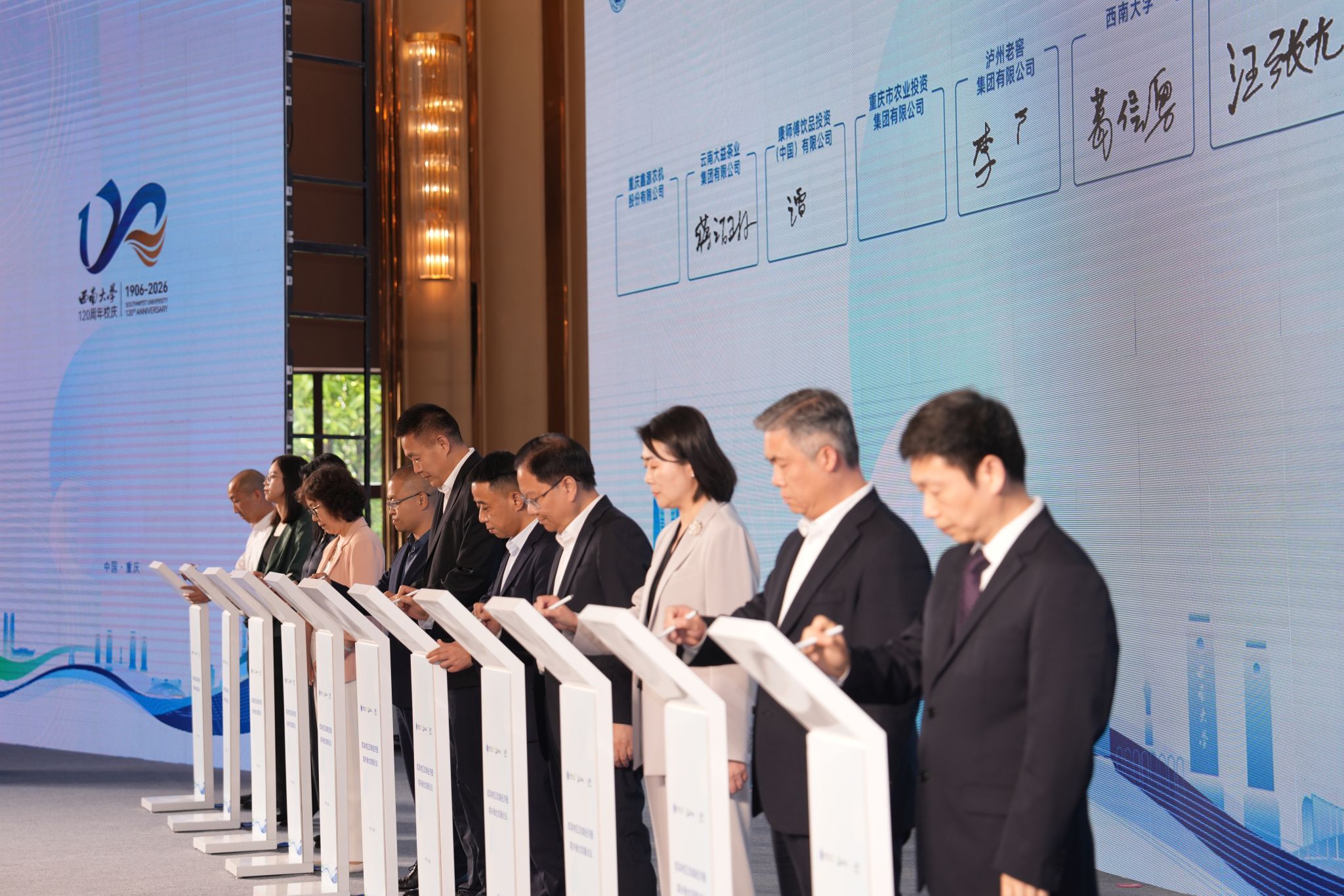 论坛成果丰硕、务实高效。现场举行了集中签约与揭牌仪式,西南大学与北碚区、荣昌区、江津区、巴南区、大足区、垫江县、秀山县、南充市、雅安市、绵竹市等10个市(区县)政府,以及科大讯飞、泸州老窖、建设银行重庆市分行、西南证券、康师傅饮品、大益茶业、中盐西南盐业、重庆农投集团、重庆江北国际机场、重庆鑫源农机等10家龙头企业签署合作协议。同时,西南大学与地方政府及龙头企业共建的现代农业科技试验示范基地、现代农业研究院、食品及农产品加工产业研究院、智慧教育联合创新实验室、山地智能农机装备研究院、具身智能工业机器人联合研究中心等10个涵盖现代农业、智慧装备、食品加工、智慧育种等关键领域的产学研合作平台正式揭牌。系列务实举措标志着校地、校企合作迈入系统化、平台化、长效化新阶段。