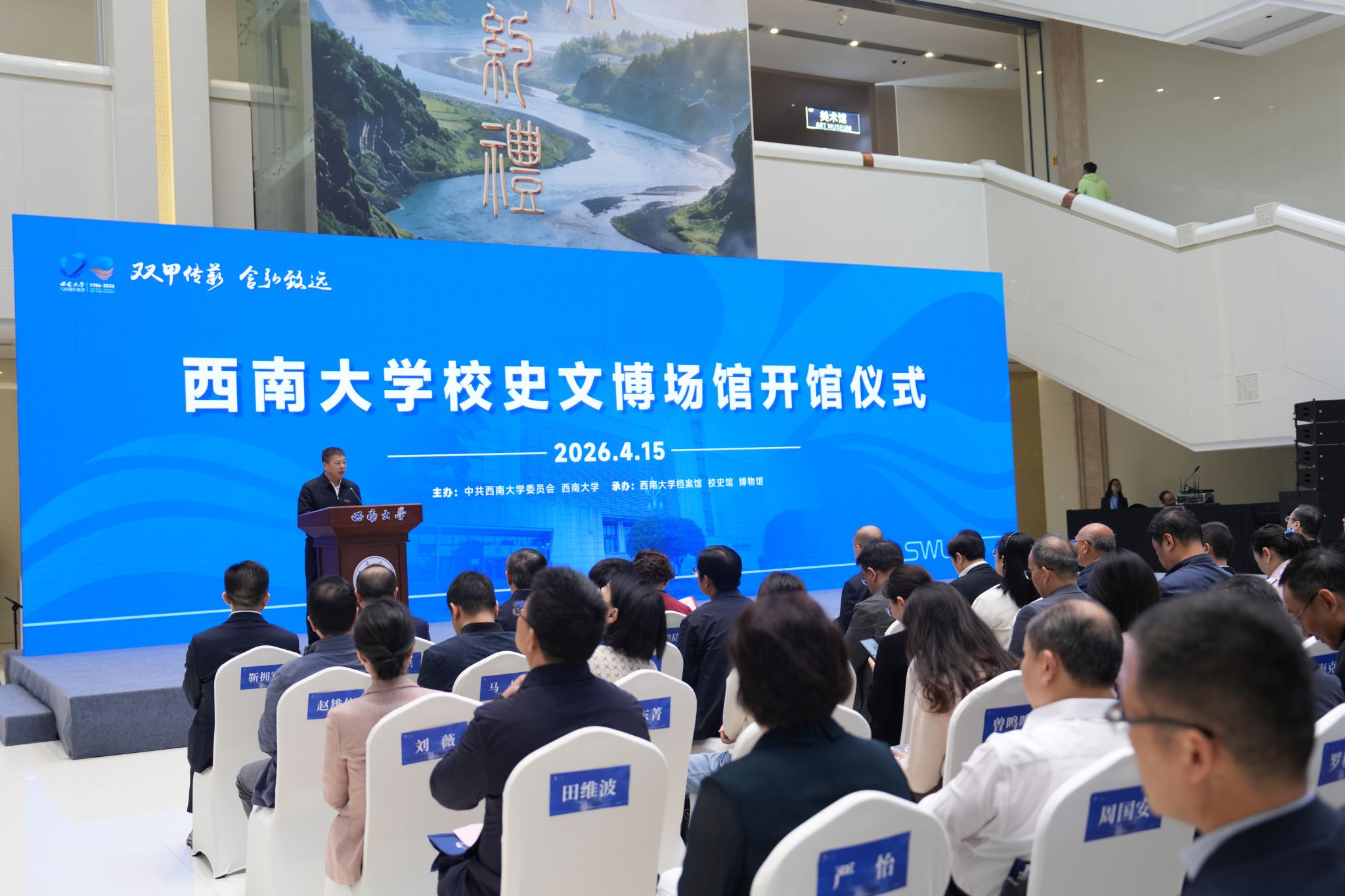 上午,开馆仪式在博物馆阳光大厅举行。重庆市委宣传部、市教委、市文化旅游委和重庆红岩革命历史文化中心、重庆中国三峡博物馆、重庆自然博物馆,北碚区委宣传部、区文化旅游委、区教委、北碚博物馆等单位相关负责人;来自清华大学、上海交通大学、四川大学、重庆大学、西北农林科技大学、陕西师大、东北师大等十余所高校博物馆同行;以及学校领导、机关部处、学院负责人及师生代表、校友代表160余人齐聚一堂,见证荣光。