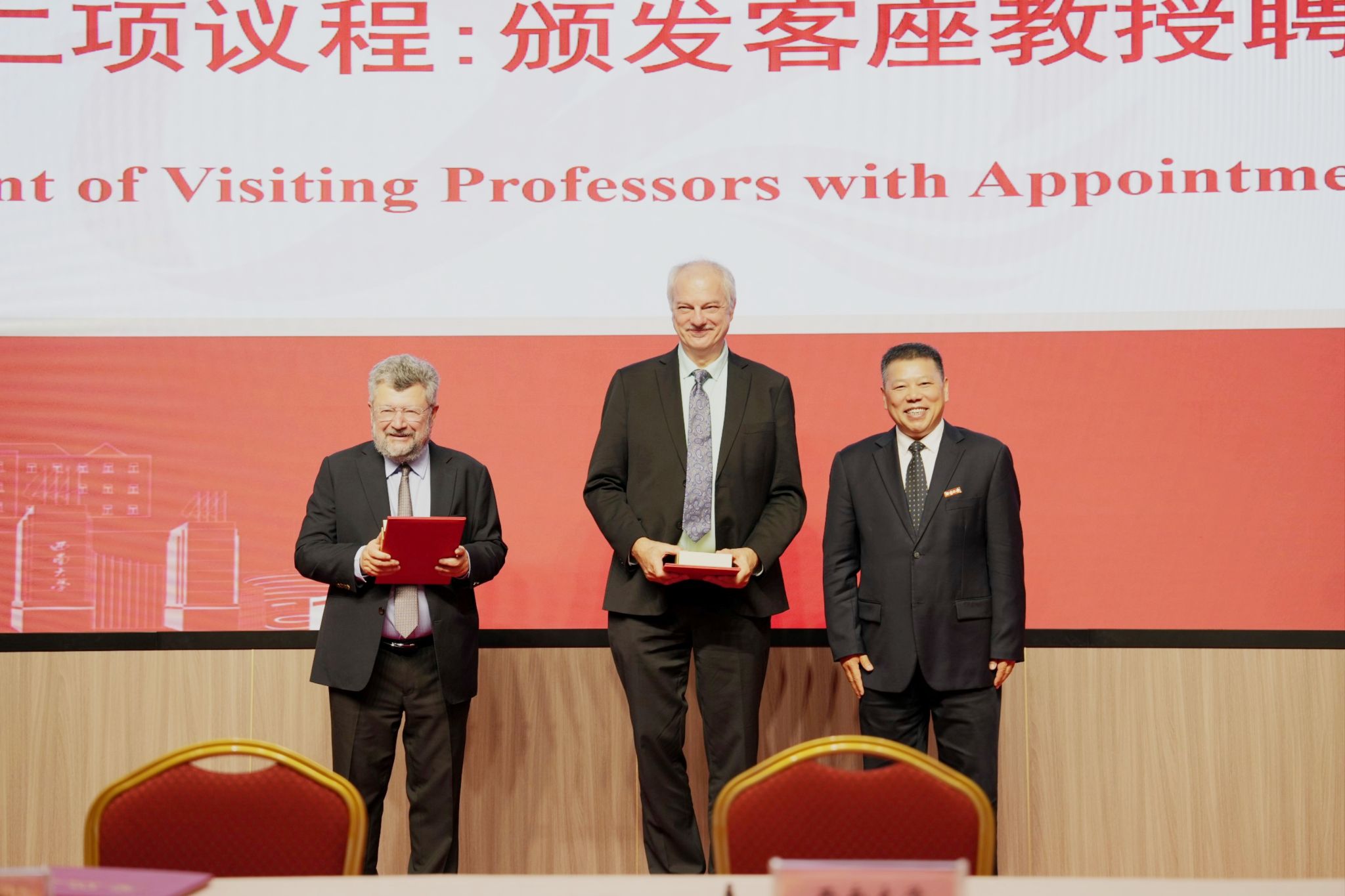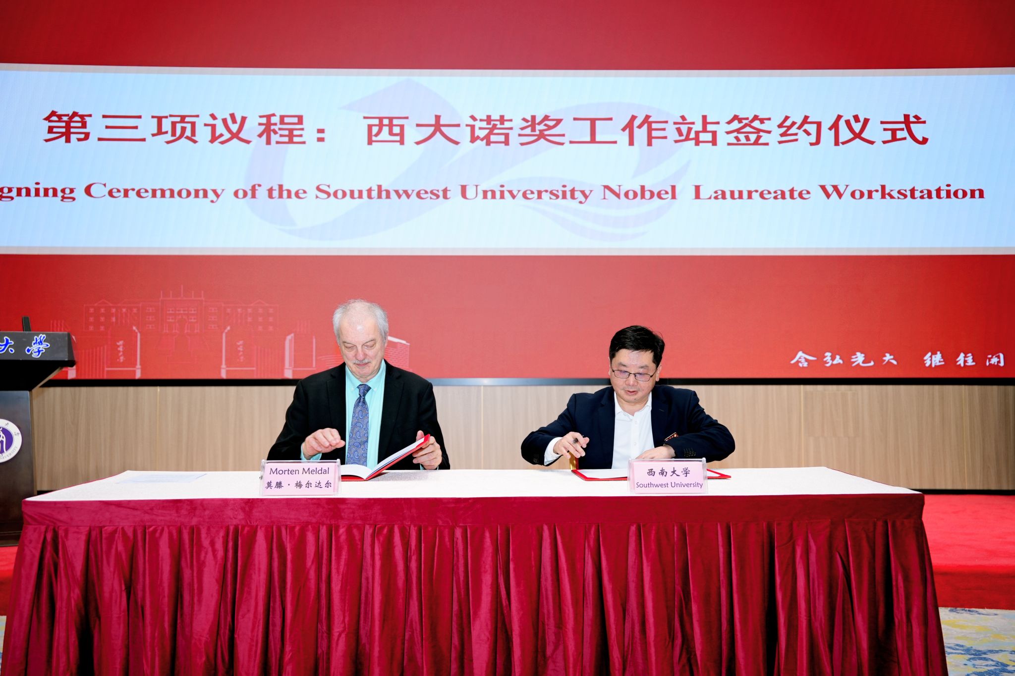 仪式上,张卫国为莫滕・梅尔达尔、埃菲・杰曼诺夫颁发了西南大学客座教授聘书。邹芙都与莫滕・梅尔达尔院士共同签署了“西大诺奖工作站”合作协议。