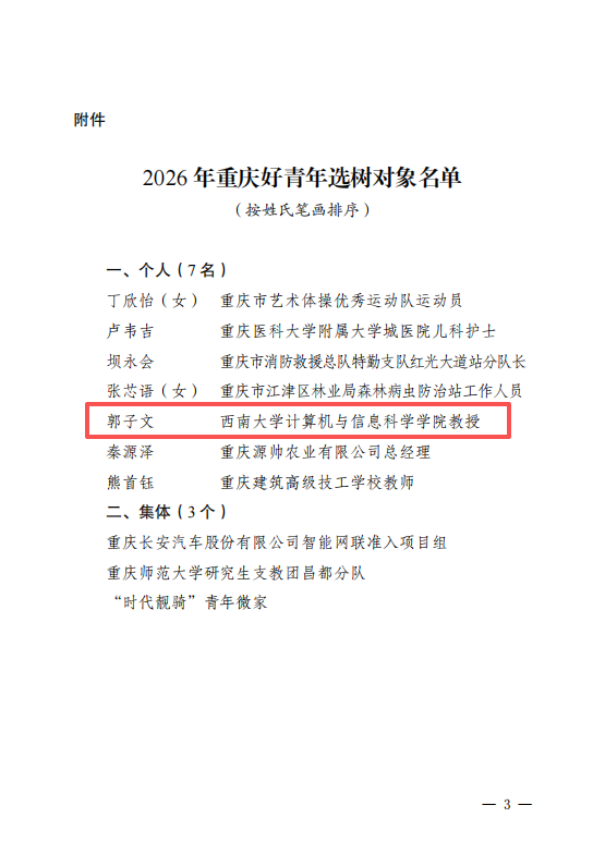 近日,共青团重庆市委公布了2026年重庆好青年选树名单,学校计算机与信息科学学院教授郭子文荣获2026年“重庆好青年”称号。