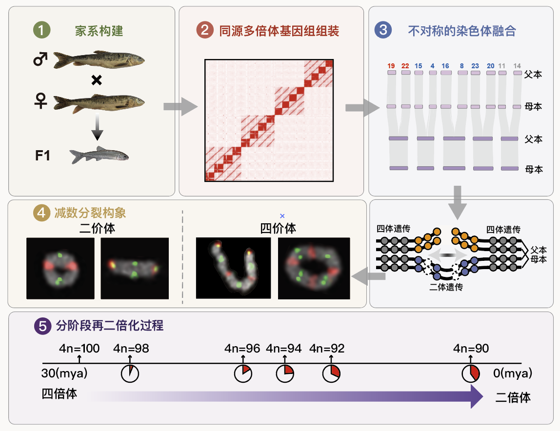 在脊椎动物演化历史上,全基因组复制事件曾多次发生。有研究表明,脊椎动物的共同祖先经历过一次全基因组复制事件(1R事件)。硬骨鱼类、鲟形目和鲑形目等谱系也独立发生过类似演化事件,因而形成了多倍体。然而,多倍体并非稳定状态,其基因组通常会逐步恢复为二倍体,这一过程被称为“再二倍化”。再二倍化会使大量冗余基因发生功能分化或获得新的功能,被认为是驱动脊椎动物谱系多样化与适应性演化的重要机制。