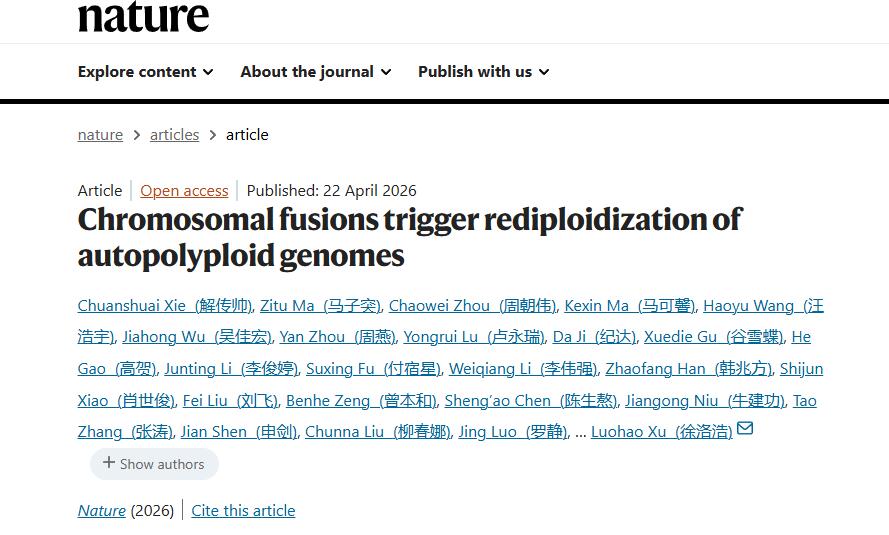 近日,学校科研团队在鱼类演化生物学研究领域取得重大突破,相关成果以《染色体融合驱动同源多倍体基因组再二倍化》(Chromosomal fusions trigger rediploidization of autopolyploid genomes)为题发表在《自然》(Nature)期刊上。该研究由学校徐洛浩教授和刘海平教授联合德国科学院院士Axel Meyer合作完成,系统揭示了脊椎动物全基因组复制(WGD)后“再二倍化”(rediploidization)的触发机制及其早期演化规律。