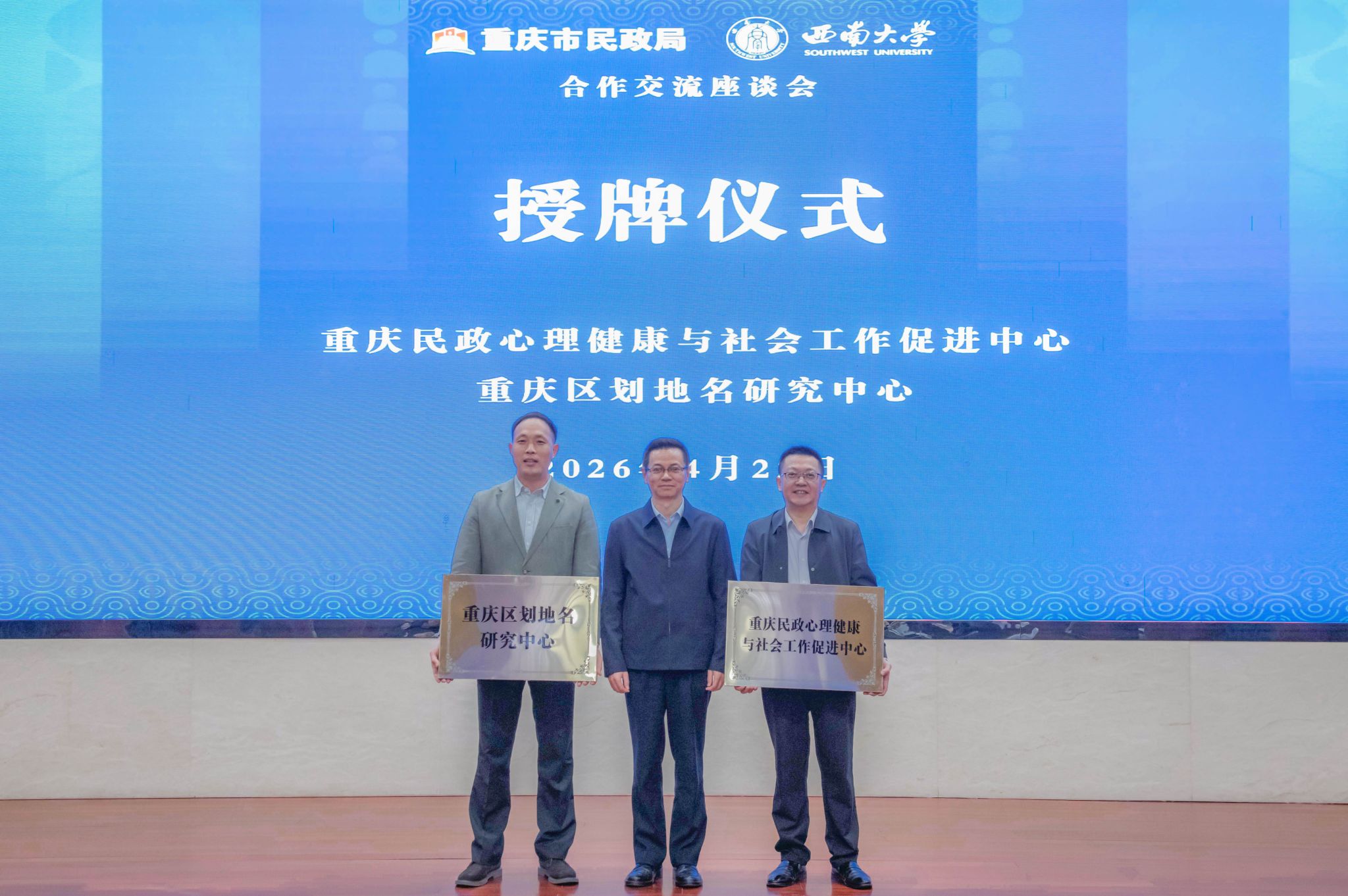 4月22日,学校与重庆市民政局在东方红会议厅举行合作交流座谈。市民政局党组书记、局长阚吉林,党组成员、副局长胡立,二级巡视员谭华,学校党委书记张卫国,党委常委、副校长葛信勇出席会议。胡立、葛信勇代表双方签署合作协议,谭华为“重庆民政心理健康与社会工作促进中心”和“重庆区划地名研究中心”授牌。会议由葛信勇主持。