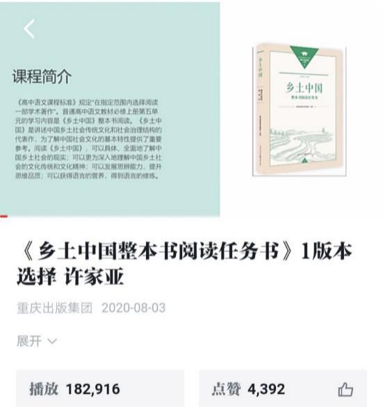 8月3日,由西南大学董小玉教授主编、重庆出版集团出版的“整本书阅读任务书”丛书之一的《〈乡土中国〉整本书阅读任务书》系列微课登录学习强国平台。首期微课《〈乡土中国〉整本书阅读任务书》由重庆外国语学校教师许家亚、余悦主讲,仅半天,视频播放量就突破10万+,同时受到重庆多家媒体关注报道。