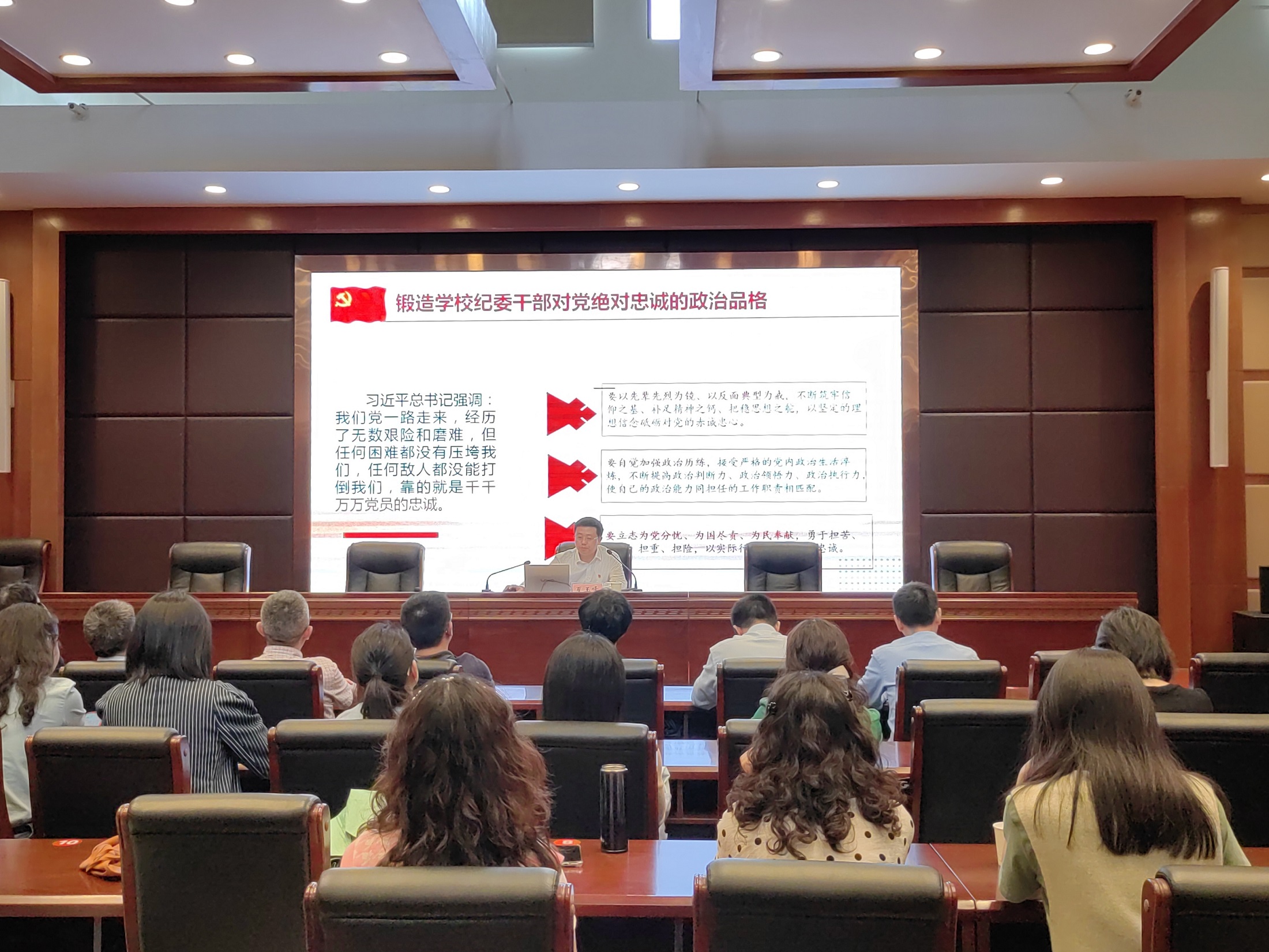 参观结束后,夏玉峰讲授《继承和发扬党的光荣传统和优良作风 锻造学校纪委干部对党绝对忠诚的政治品格》专题党课。夏玉峰强调,全体纪委干部要深刻领会和贯彻习近平总书记关于弘扬党的光荣传统和优良作风的重要论述,深刻感悟老一辈革命家的理想信念和精神风范,锻造对党绝对忠诚的政治品格。要坚持以党性立身做事,牢记“三个务必”,勇于自我革命,坚定扛起党和人民赋予的职责使命,努力把自己打造成自身正自身硬、敢于斗争善于斗争的新时代纪检监察干部,为扎实推动学校纪检监察工作高质量发展贡献力量。