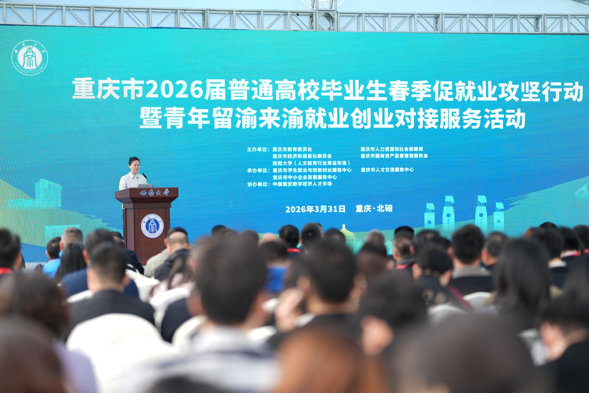3月31日,重庆市2026届普通高校毕业生春季促就业攻坚行动暨青年留渝来渝就业创业对接服务活动在学校第三运动场举行。