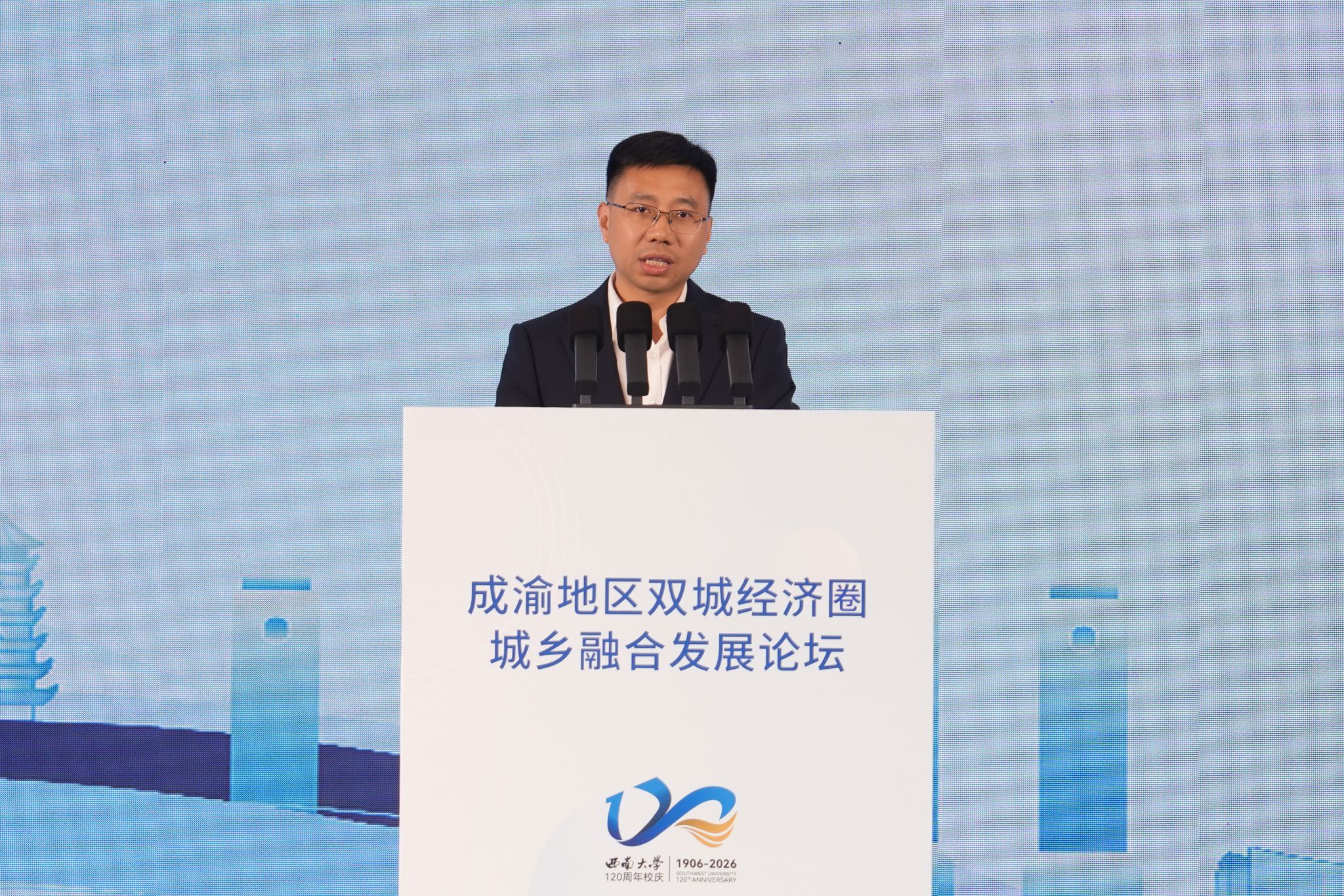 张卫国在致辞中表示,120年来,学校始终坚守 “杏坛育人、劝课农桑” 初心,把论文写在祖国大地上,在农业科技、教师教育、人才培养、社会服务等领域成果丰硕。面向新时代,学校将以此次论坛为契机,持续深化校地、校企、校际合作,推动教育链、人才链、产业链、创新链深度融合,为成渝地区城乡融合发展与中国式现代化贡献西大智慧与力量。