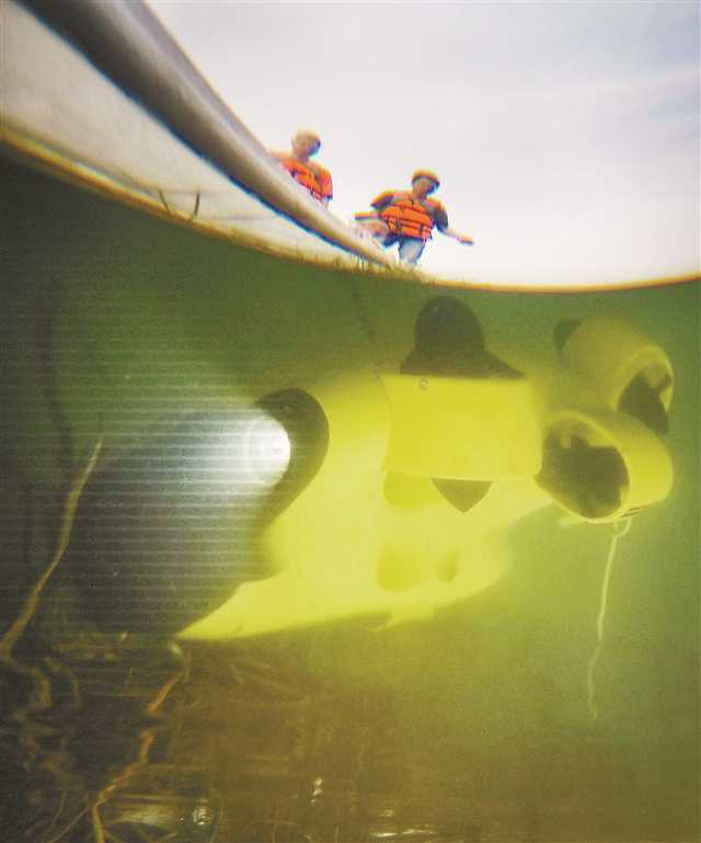 科研人员操控水下无人机,查看鱼在水草上的产卵情况。
