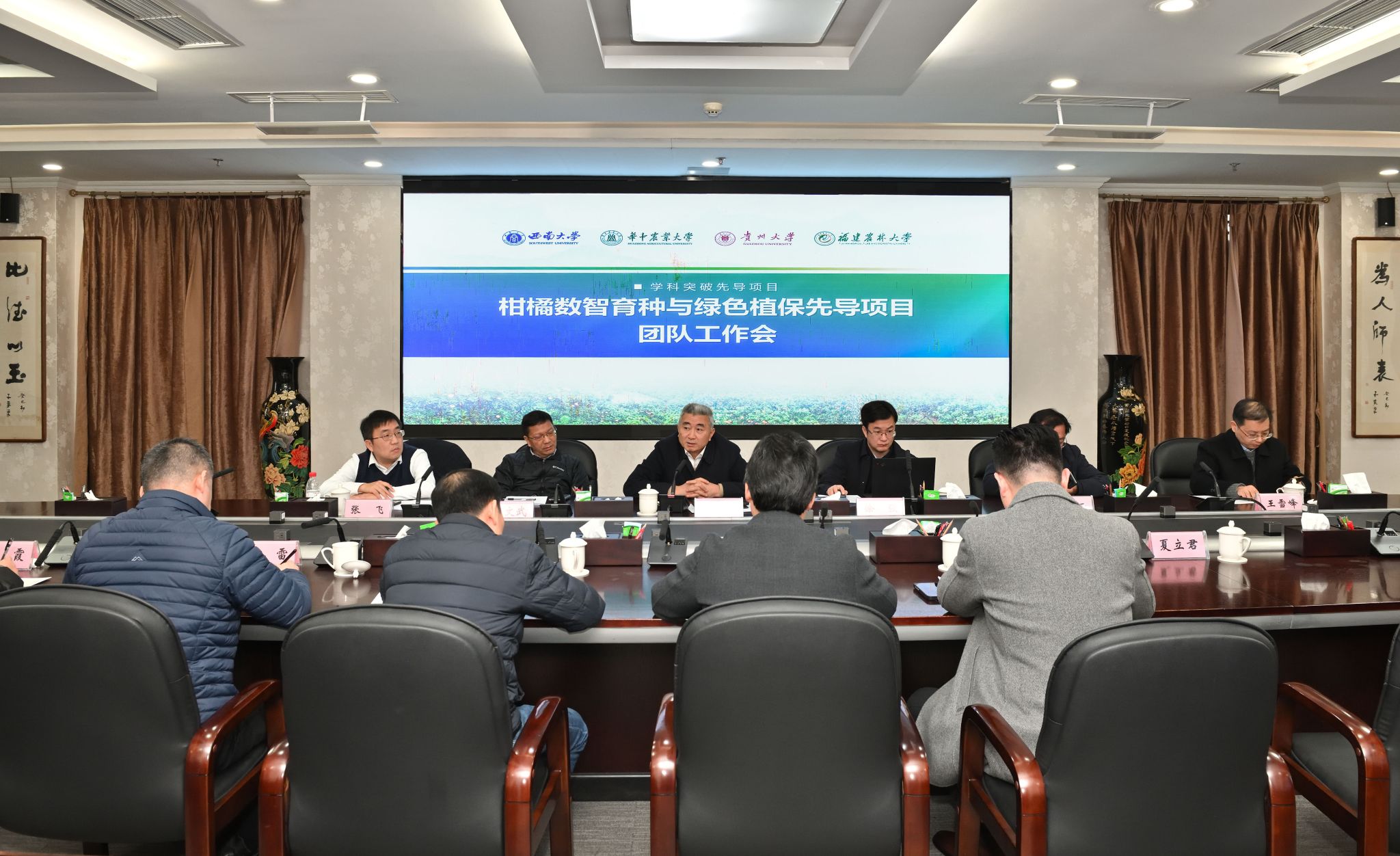 王进军在总结讲话中指出,先导项目启动实施是四校协同服务国家战略的新起点,也是推动农业科技向智能化、绿色化转型的重要实践。他强调,要深刻把握先导项目承载的国家意志与历史机遇,回答好保障国家粮食安全和重要农产品供给、引领农业科技向智能化绿色化转型的“必答题”;要聚焦“顶天立地”的科研突破,带动“新农科”拔尖创新人才培养,催生新兴交叉学科领域,全力构建教育科技人才一体化发展的“良性循环”;要强化协同担当,形成跨校、跨学科聚力攻关“生态圈”,切实筑牢项目高质量实施的组织与保障根基。他表示,作为牵头单位,西南大学将认真履行主体责任,与各兄弟高校通力协作,力争在柑橘数智育种与绿色植保领域实现核心理论和关键技术的自主突破,为教育强国、科技强国、人才强国建设贡献更大力量。