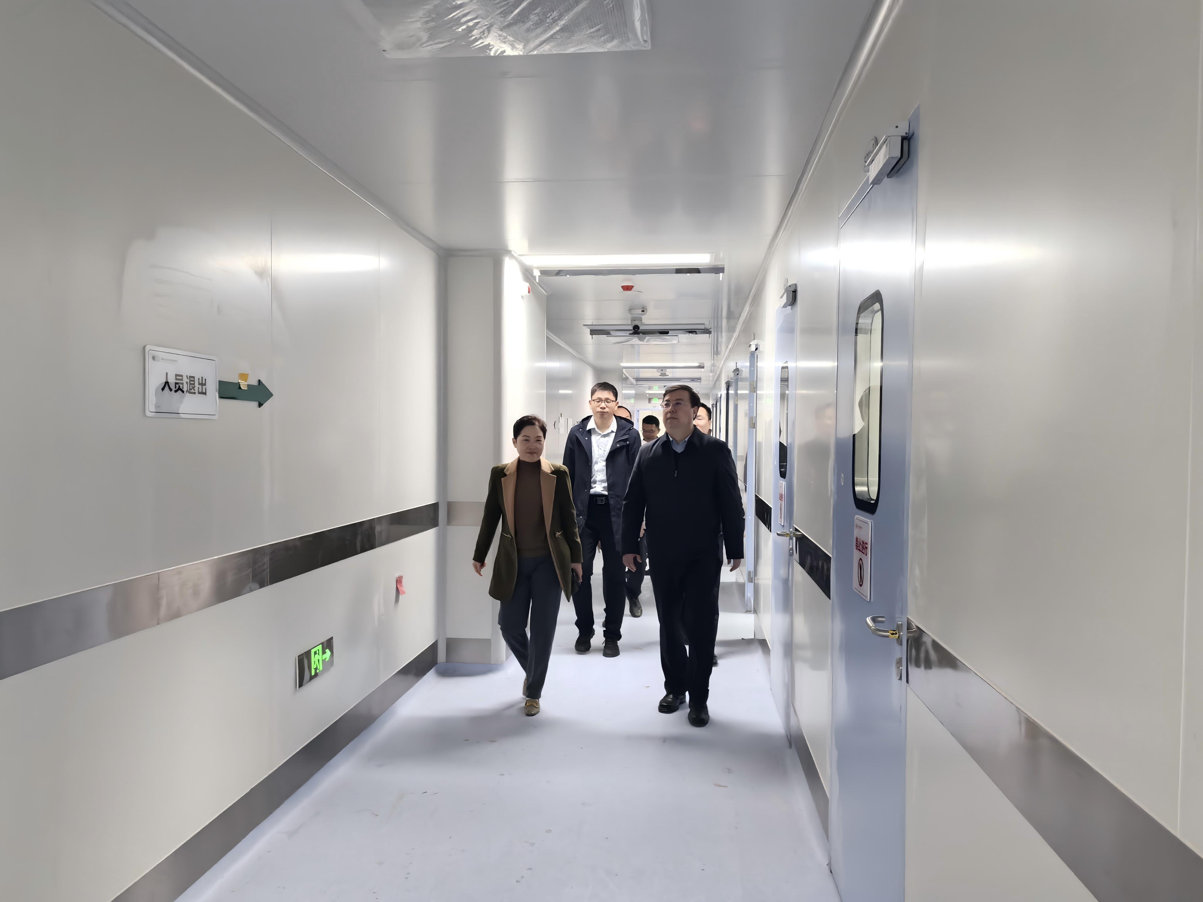 王进军一行先后实地考察了实验动物中心新建设施一层功能区、二层实验动物饲养与行为学实验区、四层生物净化与繁育区、顶层辅助设备区等区域,详细了解设施布局、功能特点及屏障环境系统维护情况,以及核心设备配置情况,并听取相关负责人工作汇报,询问建设质量管控、安全保障及后续调试验收等工作推进情况。