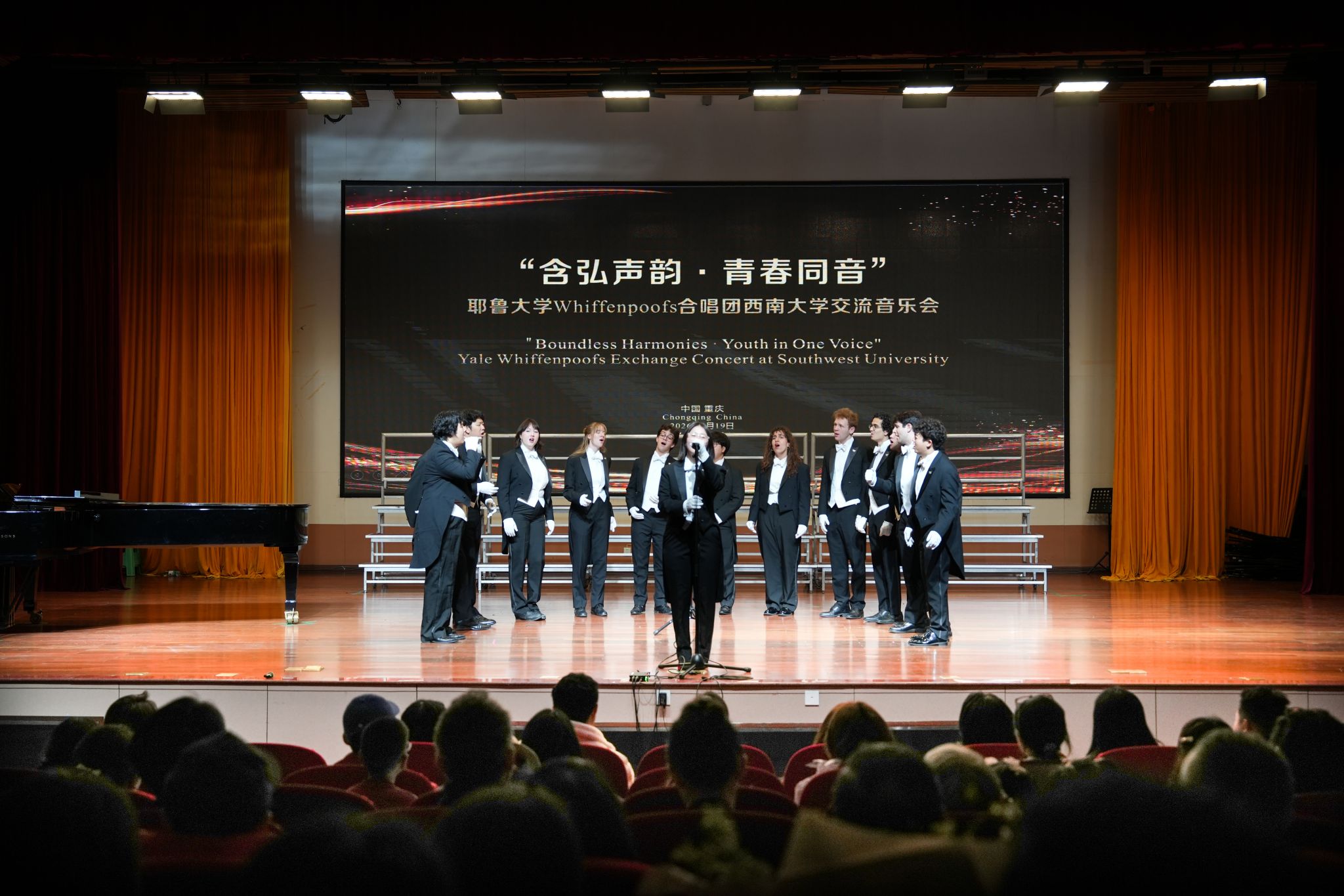 3月19日,“含弘声韵·青春同音”耶鲁大学Whiffenpoofs合唱团西南大学交流音乐会在学校大演奏厅精彩上演。来自美国耶鲁大学的Whiffenpoofs合唱团携手学校音乐学院合唱团、交响乐团联袂献艺,以歌声架起中外青年交流的桥梁。副校长赵玉芳出席活动,学校相关职能部门负责人、师生代表及北京大鸾翔宇慈善基金会代表到场观看演出。