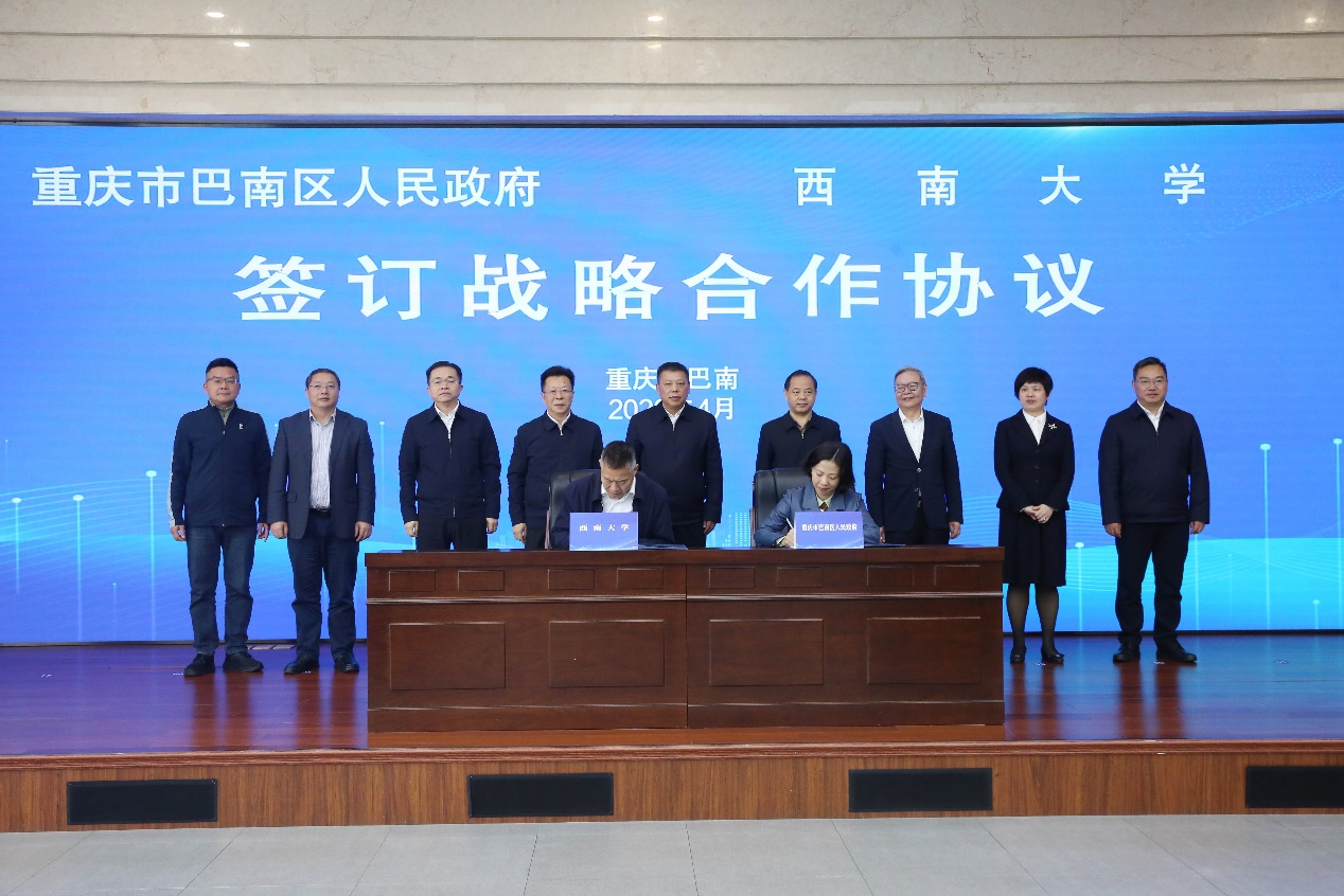 4月4日,学校与巴南区在巴南区行政中心举行合作签约仪式。巴南区委书记陶世祥,巴南区委副书记、区长钟涛,巴南区人大常委会主任刘永全;学校党委书记张卫国,副校长葛信勇,以及巴南区领导周密、艾正兵、刘功峰、李萍、王波出席签约仪式。李萍、葛信勇代表双方签署合作协议。
