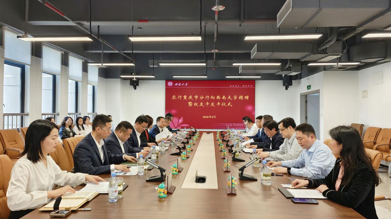 日前,中国农业银行重庆市分行向西南大学捐赠暨校友卡发卡仪式在学校举行。农业银行重庆市分行党委书记、行长朱晔,学校党委书记、教育基金会理事长张卫国;农业银行重庆市分行副行长罗波、罗永福,学校副校长邹芙都;教育基金会理事、校友企业联合会会长黎和生出席。学校党政办公室、财务部、对外联络办公室等单位负责人参加。