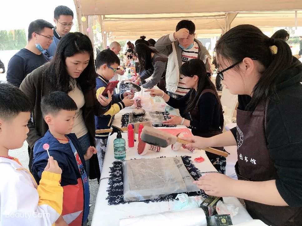 学校图书馆作为参展单位之一,为北碚市民带来了“与古有约——中国传拓技艺”展览及互动体验,让市民接触到碑刻、瓦当、印章这些平时不常见的传统文化符号。在图书馆专业馆员的指导下,参与体验的市民可以亲手将实物上的文字、图案拓印在宣纸之上,并在一系列的细致步骤之间感受中国传统文化的独特美感。