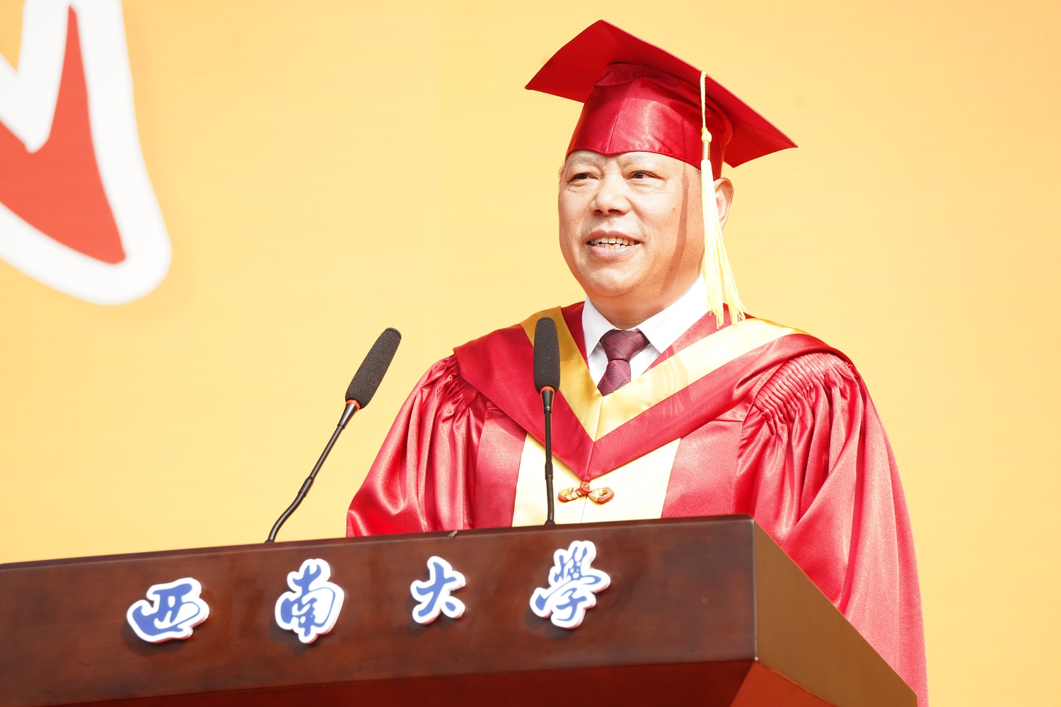 校长张卫国以“让奋斗成为人生的主旋律”为题深情寄语毕业生。他带领2023届毕业生回顾了大学四年的“独家记忆”,为大家在学业、创新实践等方面的优异表现点赞,向全体毕业生表示热烈祝贺,向培育学子成长成才的老师、家长、校友和各界人士表达最衷心的感谢。他寄语毕业生要勇于在变局中开拓人生新局,在进入“舒适区”时,敢于“跨栏”而出,面对“死胡同”时,善于择路而行;要敢于在平凡中铸就人生不凡,锤炼本领于日常,追求卓越于精微,品味甘甜于苦涩;要善于在作为中砥砺人生修为,自律自励、与人为善,慎独慎微、恪守正道,饮水思源、心怀感恩。张卫国勉励毕业生坚守西大人的风骨、才情和气派,将奋斗当作人生的主旋律,既怀抱梦想又脚踏实地,既敢想敢为又善作善成,在强国逐梦的大好时代里,绘就出壮美的人生画卷。