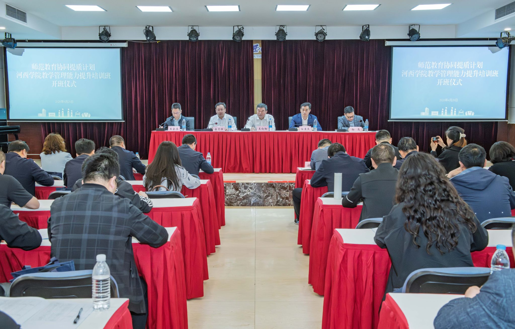 4月20日,师范教育协同提质计划河西学院教学管理能力提升培训班开班仪式在师教育学院师元讲堂举行。培训旨在落实师范教育协同提质计划部署要求,深化西南大学与河西学院在教师教育领域的务实合作,助力河西学院教学管理骨干队伍专业化水平提升。河西学院党委书记王向阳、副校长唐志强,学校副校长白显良出席开班仪式。