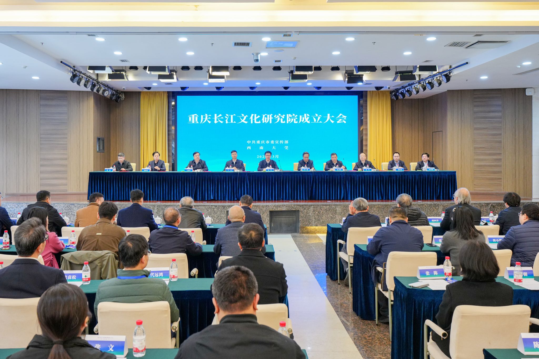 3月18日,重庆长江文化研究院成立大会暨学术委员会第一次会议在学校举行。重庆市委常委、宣传部部长姜辉出席大会并讲话。市委宣传部常务副部长李鹏,市委宣传部副部长、市广电局党组书记、局长、市广电集团(总台)党委书记、台长严兵,学校党委书记张卫国、校长王进军、副校长邹芙都等出席会议。来自中国社会科学院、复旦大学、中国人民大学、四川大学、武汉大学、南京大学等高校和科研院所的专家学者、市级相关部门负责人、学校师生代表齐聚一堂,共同见证。
